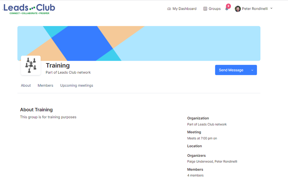 Once the group is created, you will be taken to the group's dashboard page. Dashboard is the first screen your members will see when they come to the Group page on Leads Club Chapter Portal.