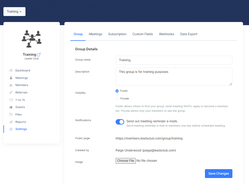 - Public: Your group will be publicly available including group page, members, and meetings.