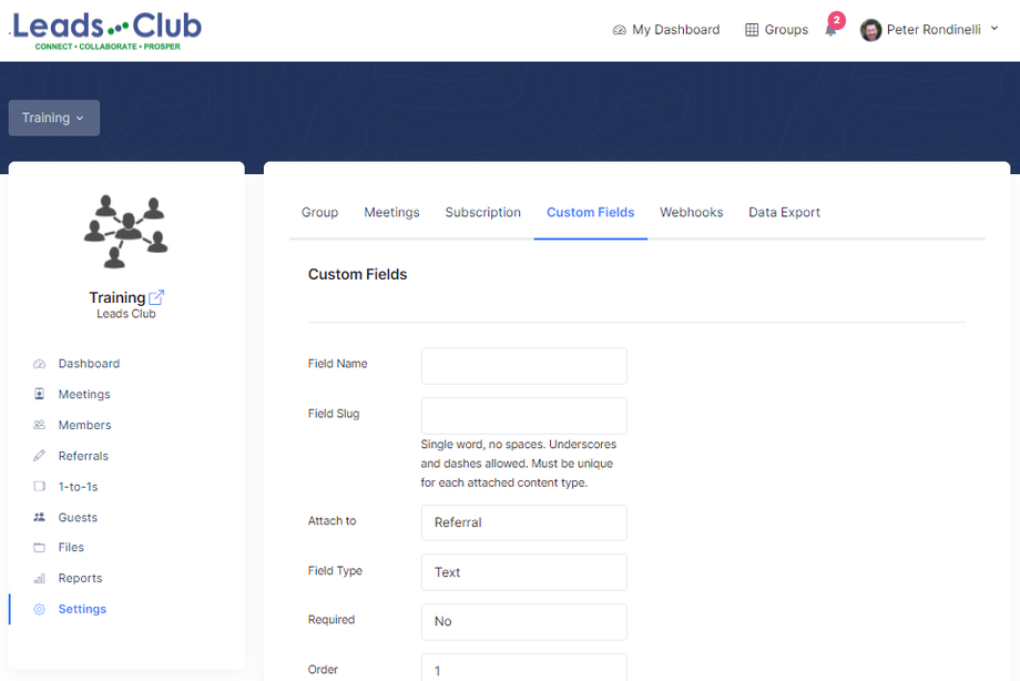 Custom fields allow additional data to be collected from members when they report referrals or 1-to-1s.