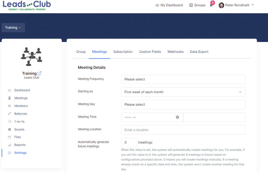 The Automated Meeting feature allows you to automatically generate meetings. After providing the meeting details for your group, simple set a value for the Automatically generate future meetings field. This field will be 0 by default, meaning you will be creating meeting entries manually. If you provide a value greater than 0, then the system will start automatically generating future meetings for you.